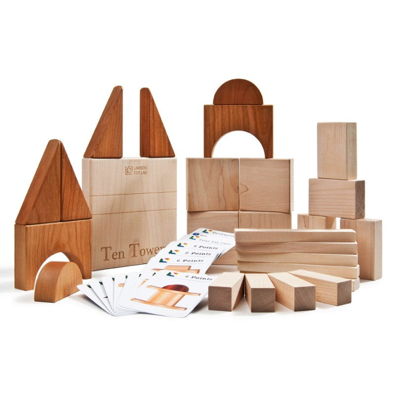 The Ten Towers game by Larsen Toy Lab perfectly walks the fine line between cooperation and competition, while staying fun and engaging for the little ones. As a group players take turns building a tower shown on the card, and whoever puts the last block in place is rewarded!