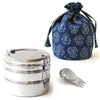 Stacking and packing a healthy lunch is easy as 1-2-3 with this elegant Tri Bento Lunch Kit from ECOlunchbox. The classic stainless steel stackable bento box is made up of three separate layers neatly clipping together, and round shaped like food containers ("tiffins") used throughout India for generations. The colorful cotton Bentobag is sewn from artisan textiles using wooden blocks and heirloom wax batik techniques. Simply tuck the stainless steel lunchbox into this zippy bag, cinch it closed with the handy drawstring ties, and you're good to go in eco style!