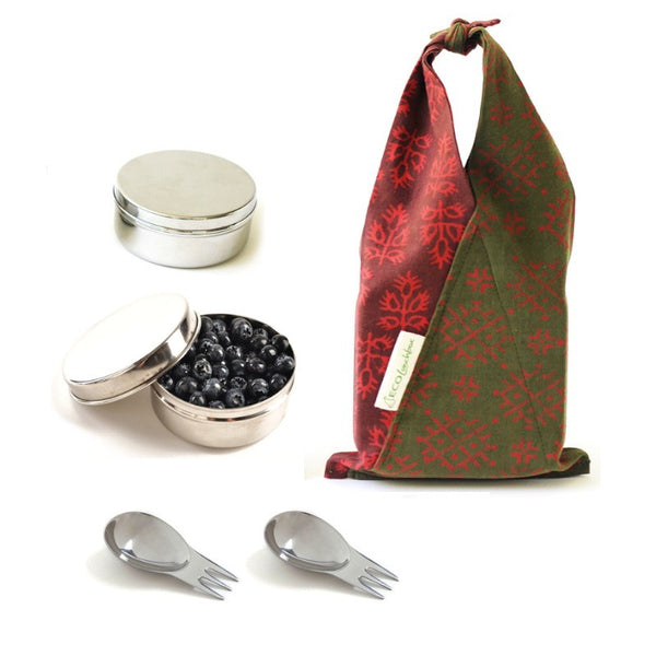 The unique Fursoshiki Snacksack Kit from ECOlunchbox handily fits 2 ECOdippers plus a whole piece of fruit or a small water bottle. The colorful sack is sewn from artisan textiles printed using wooden blocks and wax batik techniques perfected over generations. Inspired by traditional furoshiki eco bags from Japan, the snacksack is a chic and versatile on-the-go snack or lunch solution. With one easy tie, you can say goodbye to plastic baggies!