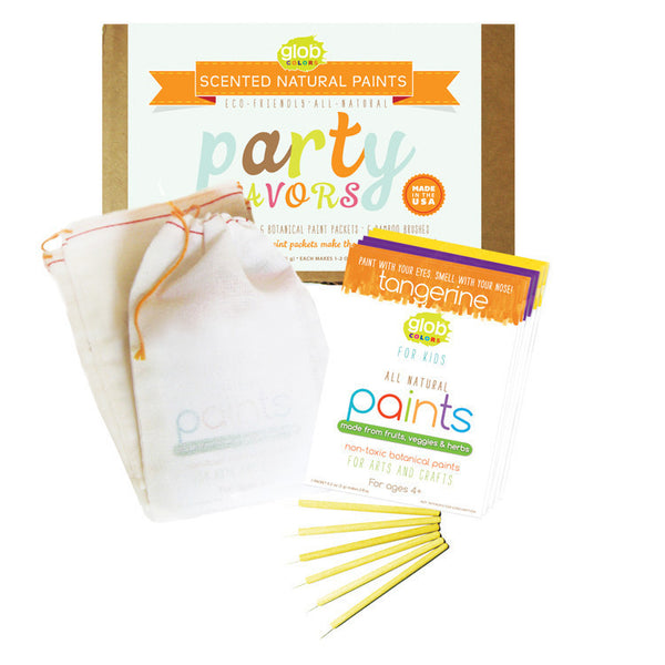 Glob Colors paint packets make the perfect party favors! Make your kids' birthday or other party super special with naturally scented botanical paint favors, complete with cotton bags and mini brushes.