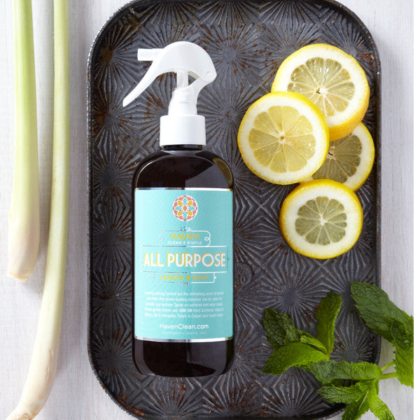 Clear your cabinets! HAVEN's All-Purpose Cleaner replaces up to 12 different products under your kitchen sink. Blending pure, botanical ingredients, this refreshing Lemon Mint cleaner leaves nothing behind but the invigorating scent of lemon, lemongrass, and mint.