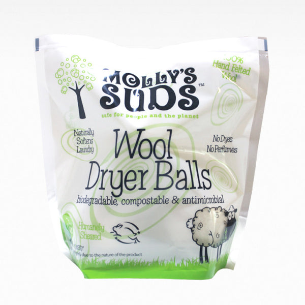 Replace the need for toxic fabric softeners with Molly’s Suds 100% hand felted Wool Dryer Balls, which last up to 1,000 loads in the dryer, or three years, and reduce drying time.