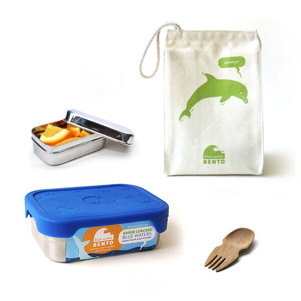 Make a splash at lunchtime with the Blue Water Bento Lunch Kit from ECOlunchbox. This plastic-free lunchware set includes a Splash Box™ with a matching organic cotton Lunch Sack, stainless steel Lunchpod, and bamboo spork. Perfect for kids of all ages!