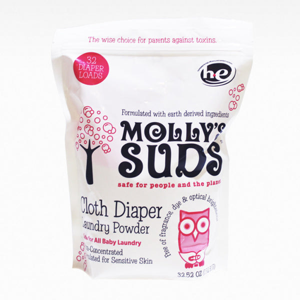 Molly's Suds Cloth Diaper Powder is safe for all cloth diaper fabrics and gentle to sensitive skin. It also works great on whites and baby clothes. Stained bib? No worries! Do an overnight soak and stains will be gone. Cloth diapers are a true science and this all natural laundry detergent is awesome with all stinks, stains and fabrics.