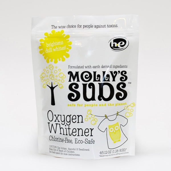 Does hard water leave your whites dingy? Do you need a little something extra to make your whites pop? Molly's Suds Oxygen Whitener laundry detergent uses sodium percarbonate and other earth derived ingredients to aid in breaking down hard water minerals to bring life back to your whites! While it is color safe, we recommend you test a small spot first to ensure fabric compatibility.