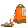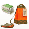 The handmade lunch bag is machine washable and sewn from textiles that are hand block printed by artisans in India. Fully reversible and adjustable to fit children and adults, the bag has a unique strap design that can be buttoned down into a backpack or unbuttoned for carrying as a shoulder or hip bag. The three matching napkins measure are designed for use as placemats or napkins.
