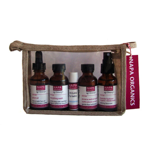 Your on-the-go supply of Agribeauty skincare, this travel kit keeps skin happy, clean, and hydrated with one ounce versions of Napa Organics' bestselling products. Comes in a handy hemp, recycled , and phthalate-free cosmetic bag.