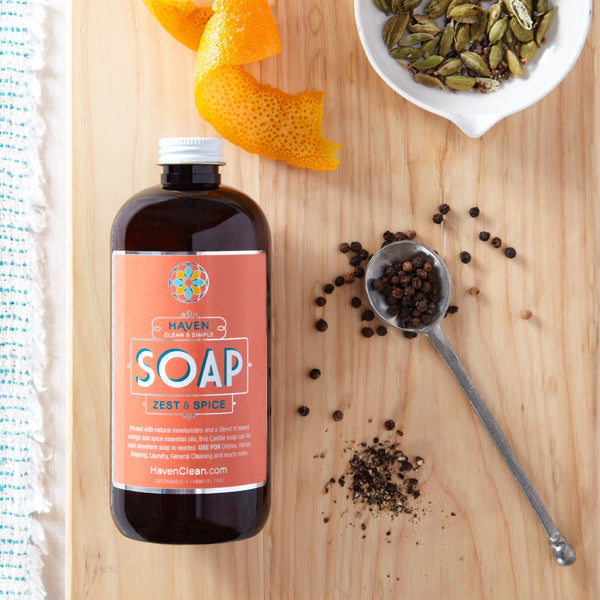 HAVEN's delicious smelling wonder soap is infused with moisturizers and natural solvents, making it tough enough for dishes but gentle enough to use as hand soap. Also great for mopping, washing clothing, and general surface cleaning. This soap is as natural as it gets and contains no irritants or detergents!