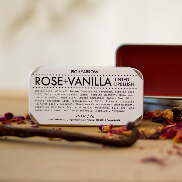 FIG+YARROW's delicately flavored rose-tinted blushing balm for lovelier lips. Made with highly nourishing, protective, and antioxidant-rich organic plant oils, butters and waxes, this lip balm is naturally tinted with alkanet root and kissed with a touch of pure rose and vanilla essential oils for a very special oral treat.